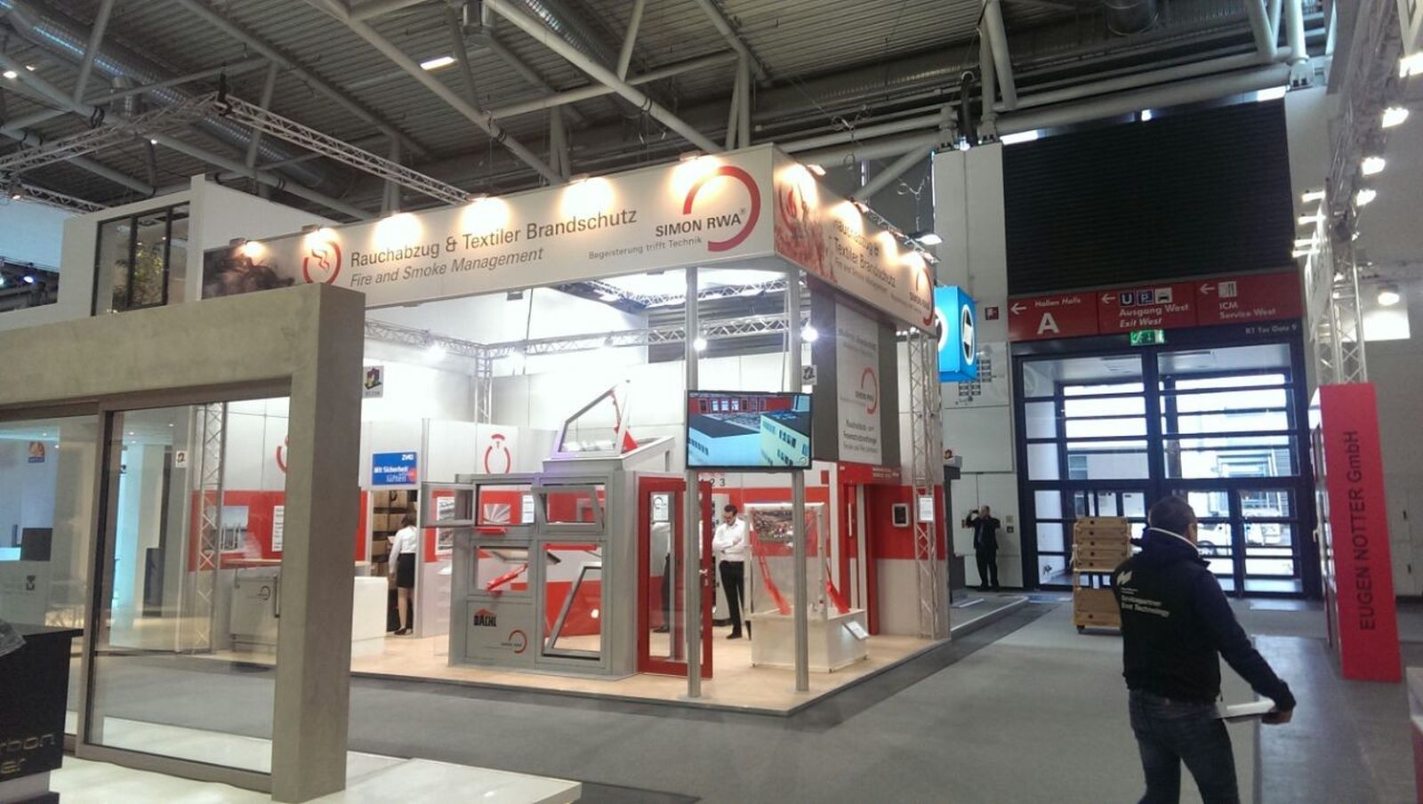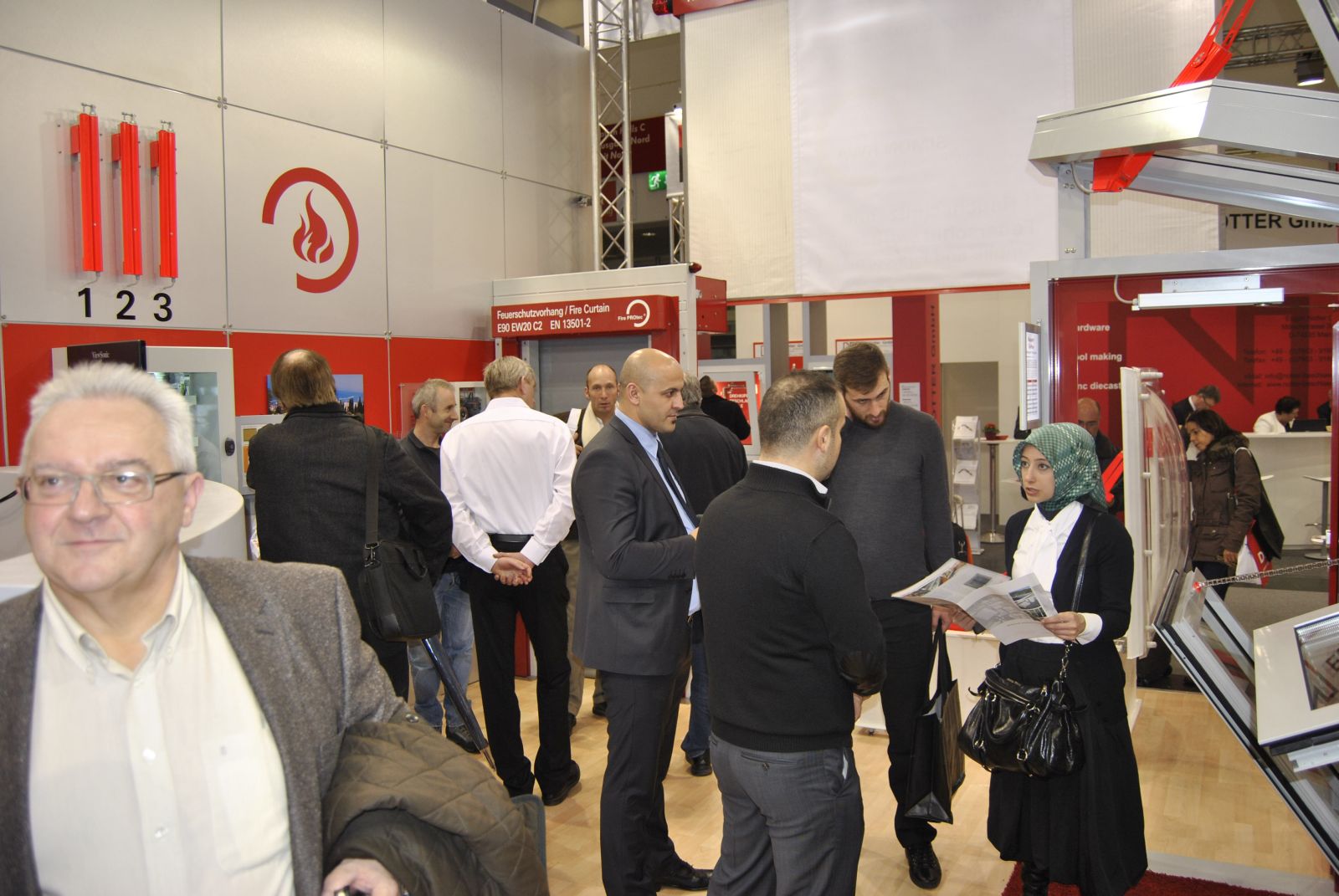 Simon Link® per Touchscreen. Die Basis ist geschaffen für eine unendlich große Anzahl an Einstell- und Kombinationsmöglichkeiten der verschiedenen Module. Die Kompaktzentraleinheit M-SHEV-10-AP ist in Kürze lieferbar. Im Bereich der Vorhangtechnik konnten wir unsere Breite Palette an Rauch- und Feuerschutzvorhängen präsentieren. Neben den klassischen Smoke PROtec® und Fire PROtec® Systemen hatten wir auch ein FireScreen-EI System mit einer Klassifikaton von EI 60 (isolierend für über 60 Minuten ohne Sprinkler) ausgestellt.