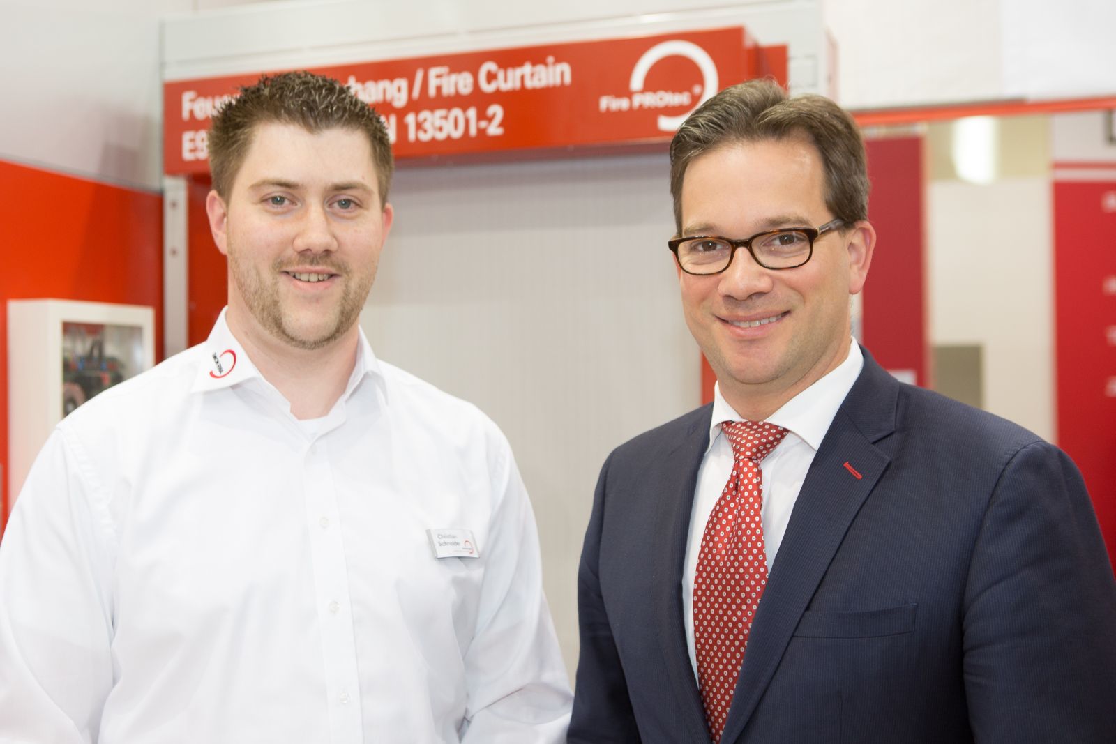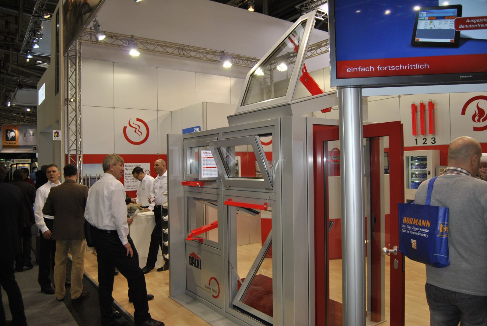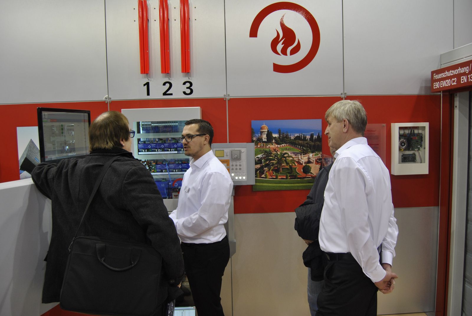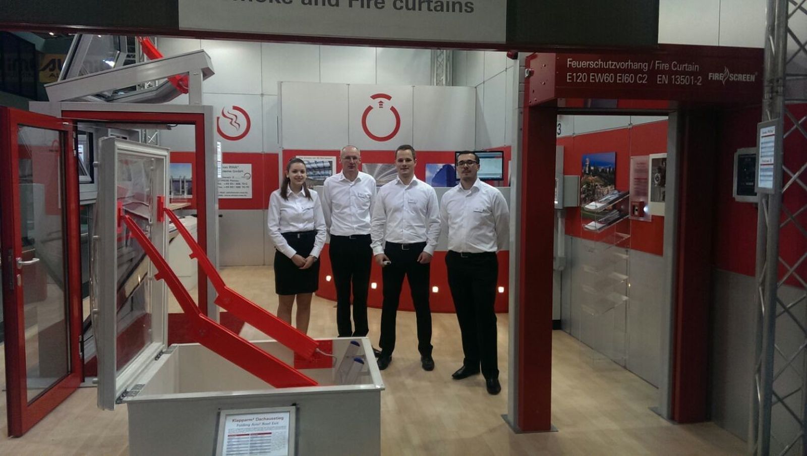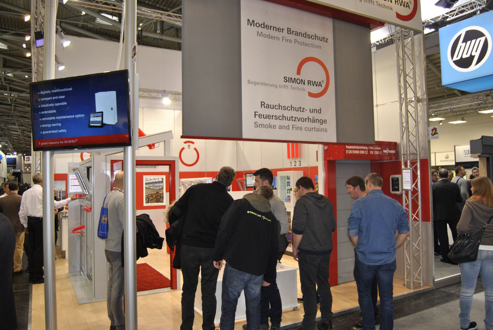 Simon Link® per Touchscreen. Die Basis ist geschaffen für eine unendlich große Anzahl an Einstell- und Kombinationsmöglichkeiten der verschiedenen Module. Die Kompaktzentraleinheit M-SHEV-10-AP ist in Kürze lieferbar. Im Bereich der Vorhangtechnik konnten wir unsere Breite Palette an Rauch- und Feuerschutzvorhängen präsentieren. Neben den klassischen Smoke PROtec® und Fire PROtec® Systemen hatten wir auch ein FireScreen-EI System mit einer Klassifikaton von EI 60 (isolierend für über 60 Minuten ohne Sprinkler) ausgestellt.